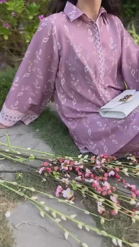 Stay effortlessly stylish in this lilac two-piece co-ord set, crafted from our in-house, crease-resistant blended fabric that mimics the softness of Swiss lawn. Perfectly light and breathable for summer. Featuring delicate leaf motifs and detailed borders on the sleeves and trousers, this set combines comfort with elegance for your everyday look.