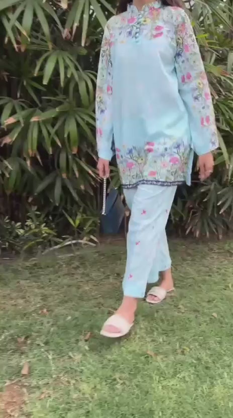 Fresh, breezy, and effortlessly elegant – Daylight is your go-to look for sunny days. Featuring a soothing sky blue base with delicate floral prints, this two-piece set is crafted from our signature in-house, crease-resistant fabric, offering the softness and drape of Swiss lawn.
