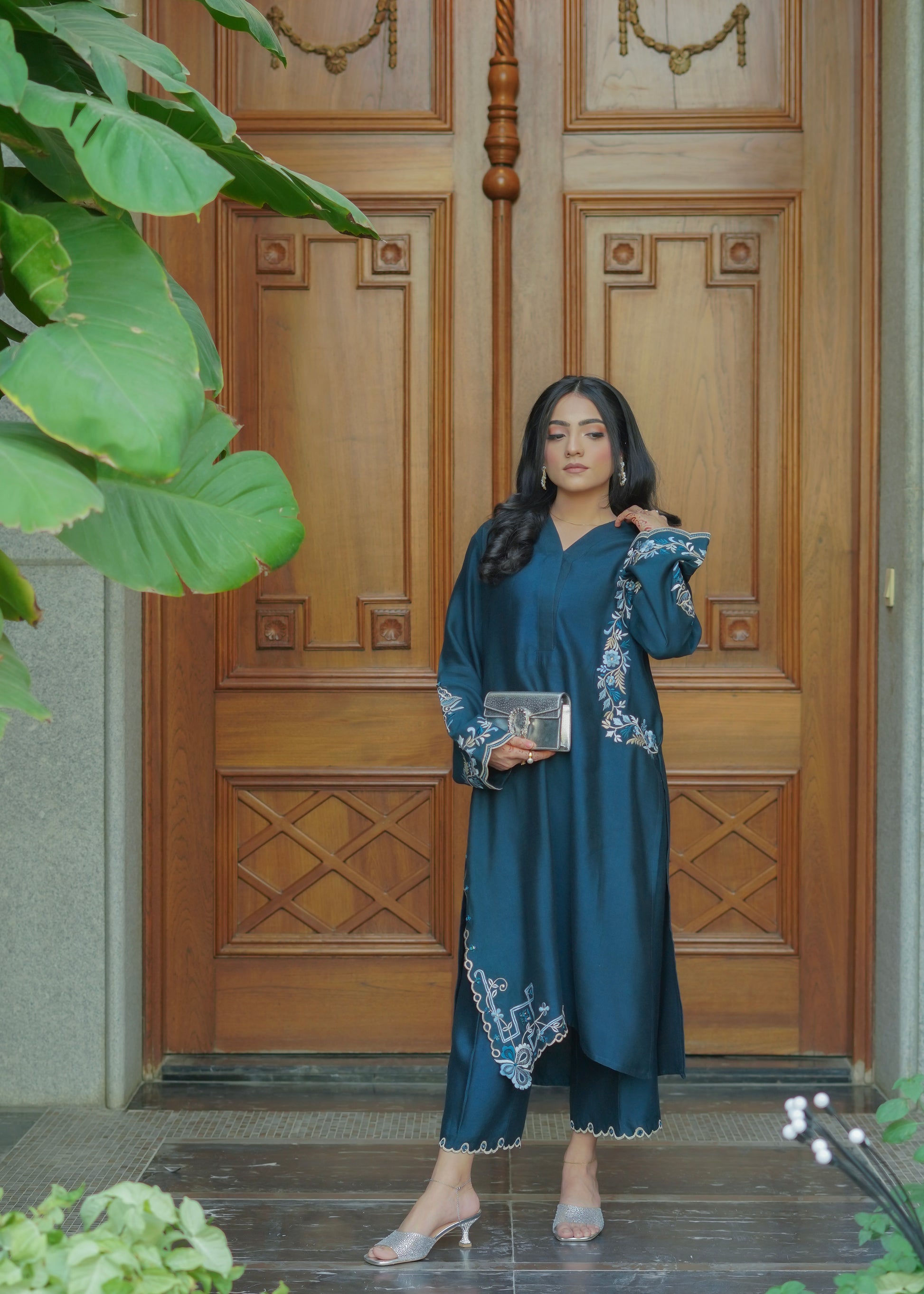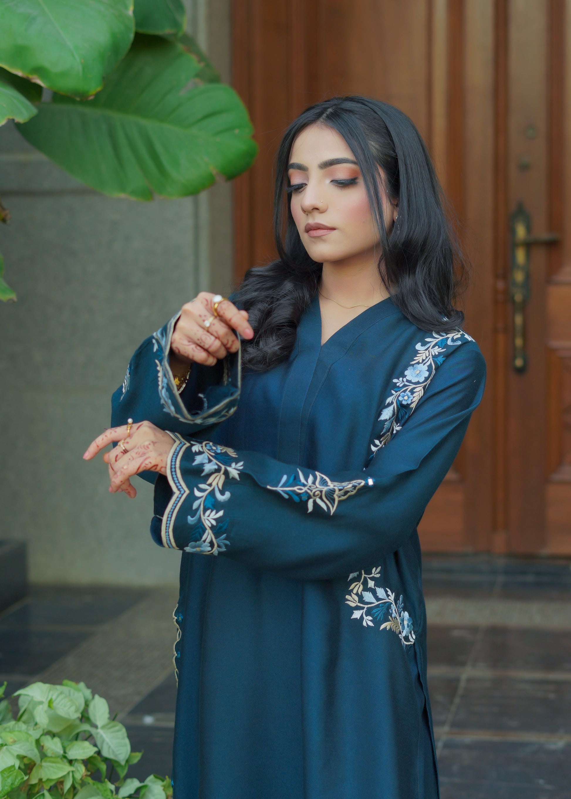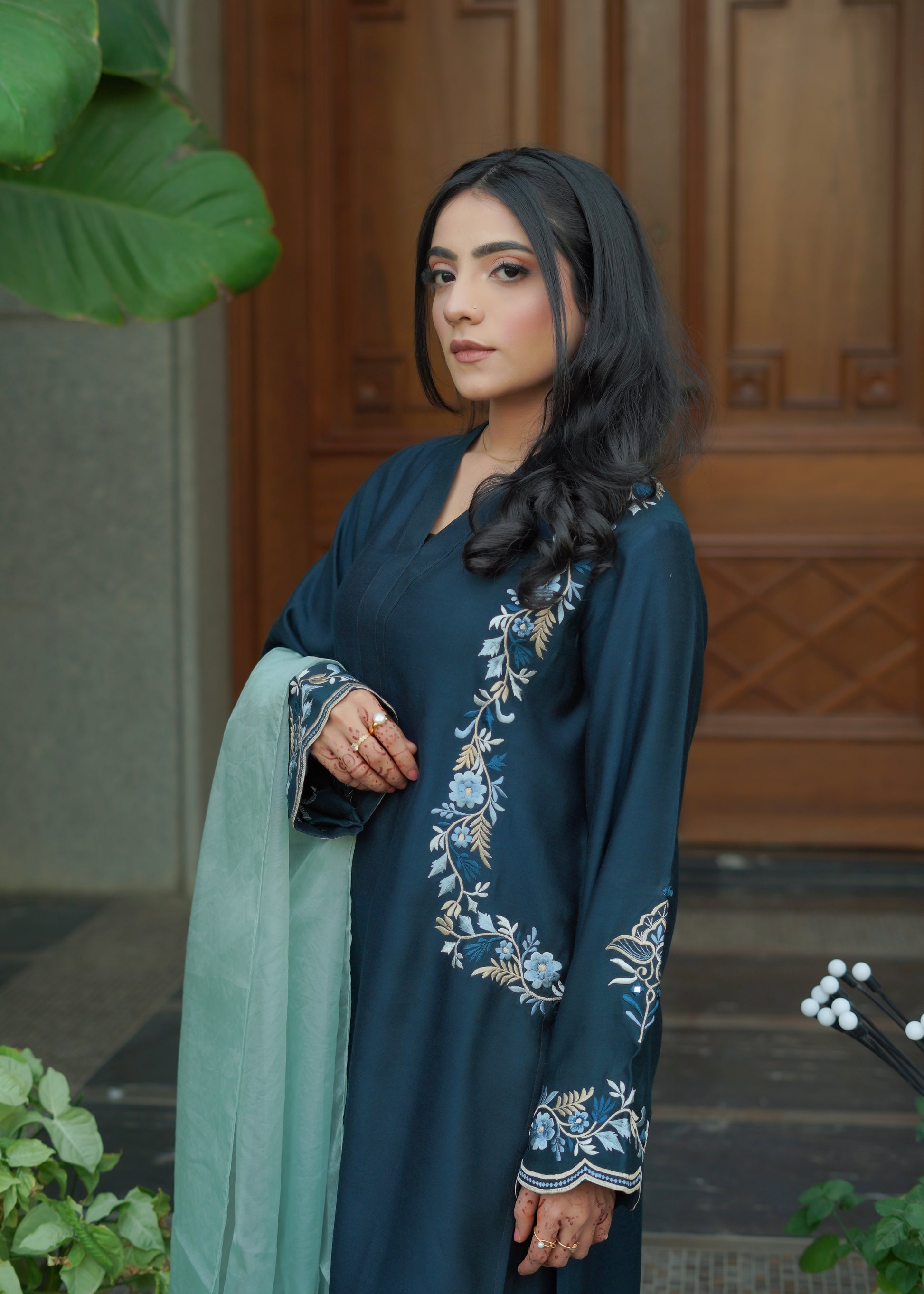 Emerald Aura combines a rich deep-blue Khaddi Silk base with a soft, light-blue dupatta a harmonious, celestial contrast reminiscent of ocean hues meeting morning sky. Fully adorned with delicate embroidery, this masterpiece is designed to elevate your wardrobe with understated luxury.