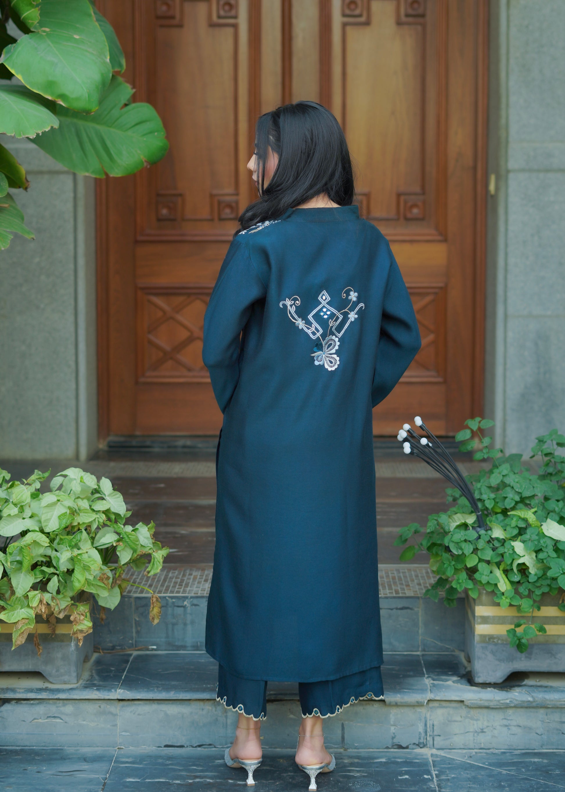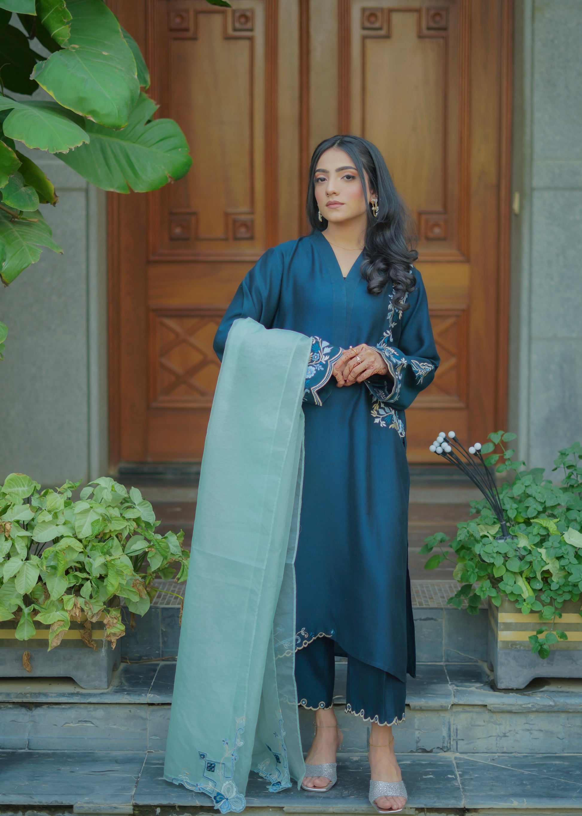 Emerald Aura – Deep Blue Khaddi Silk Set with Light Blue Dupatta