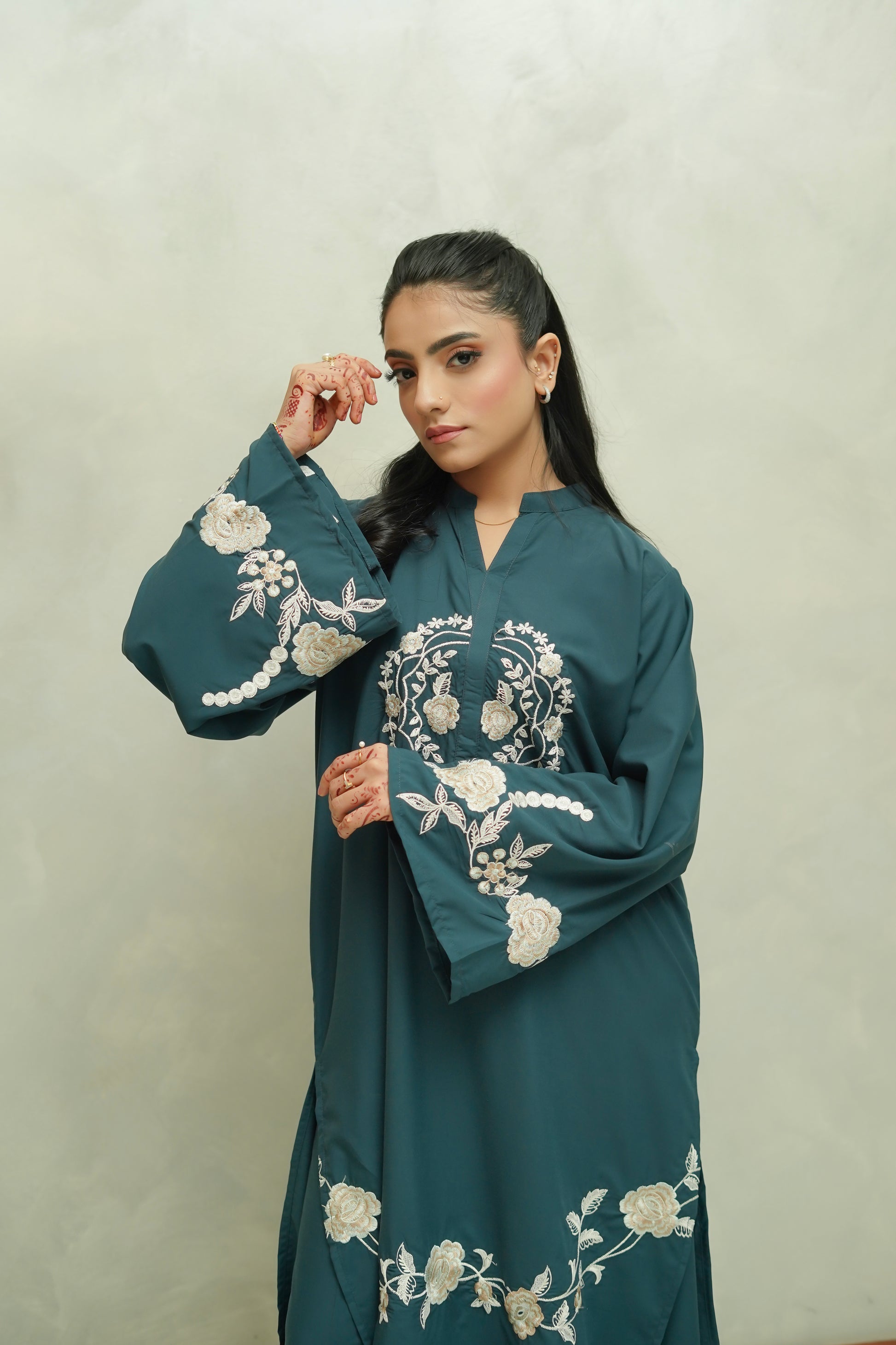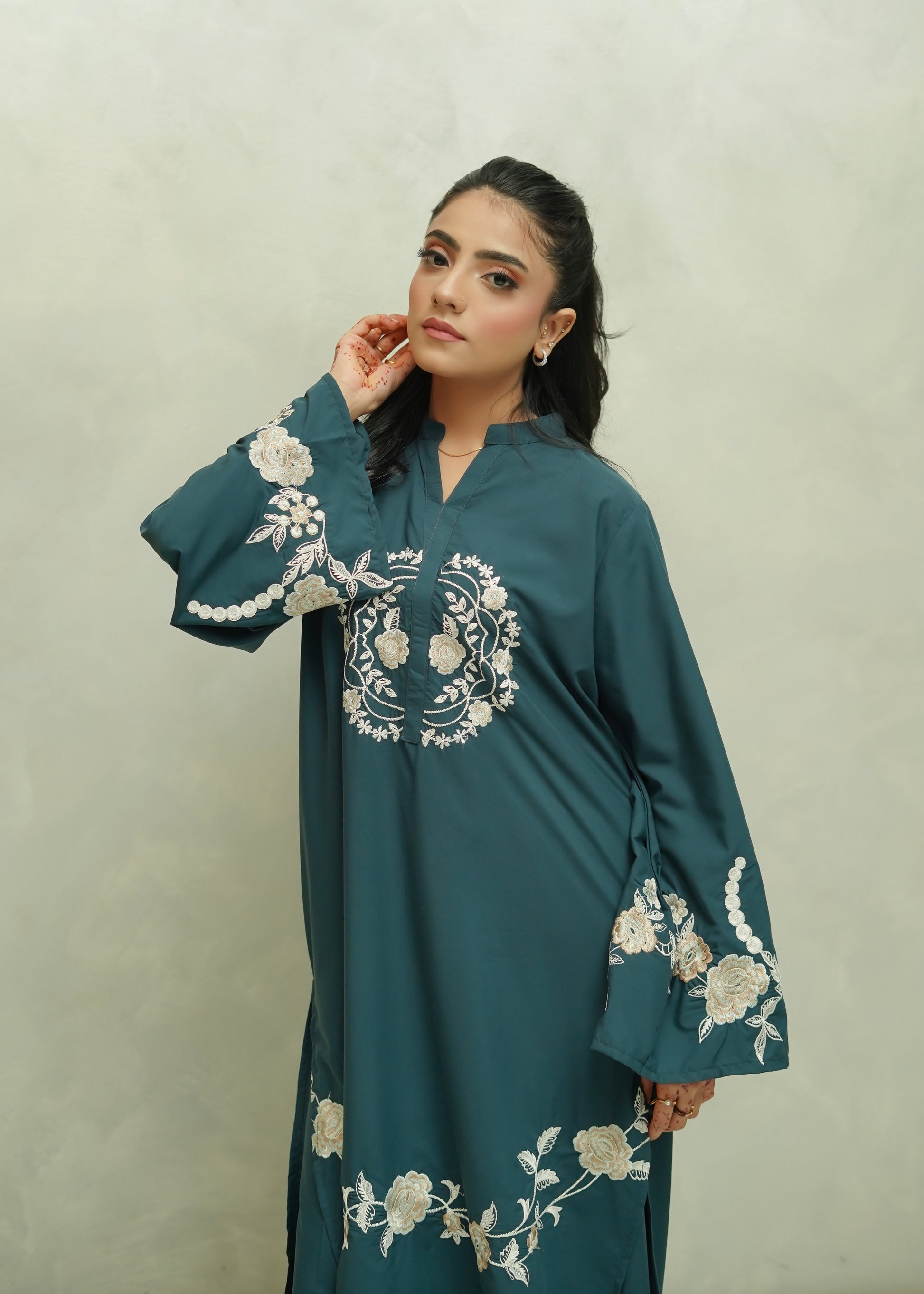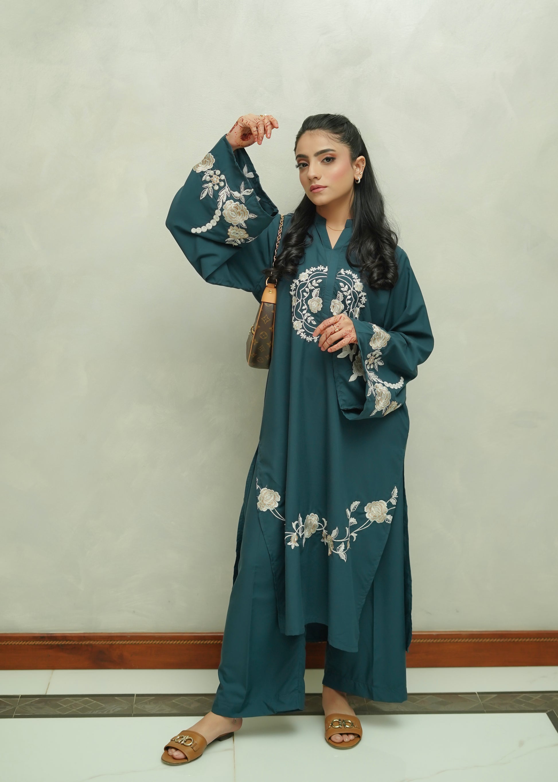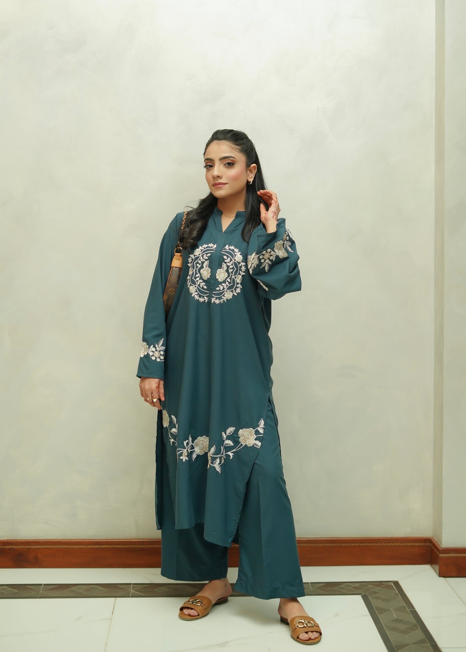 Bold yet graceful, Emerald Aura stands out with its rich teal tone designed to elevate your wardrobe. Made with lightweight blended viscose, this embroidered two-piece delivers both sophistication and ease. The refined embroidery adds charm, while the breathable fabric keeps you cool throughout the season.