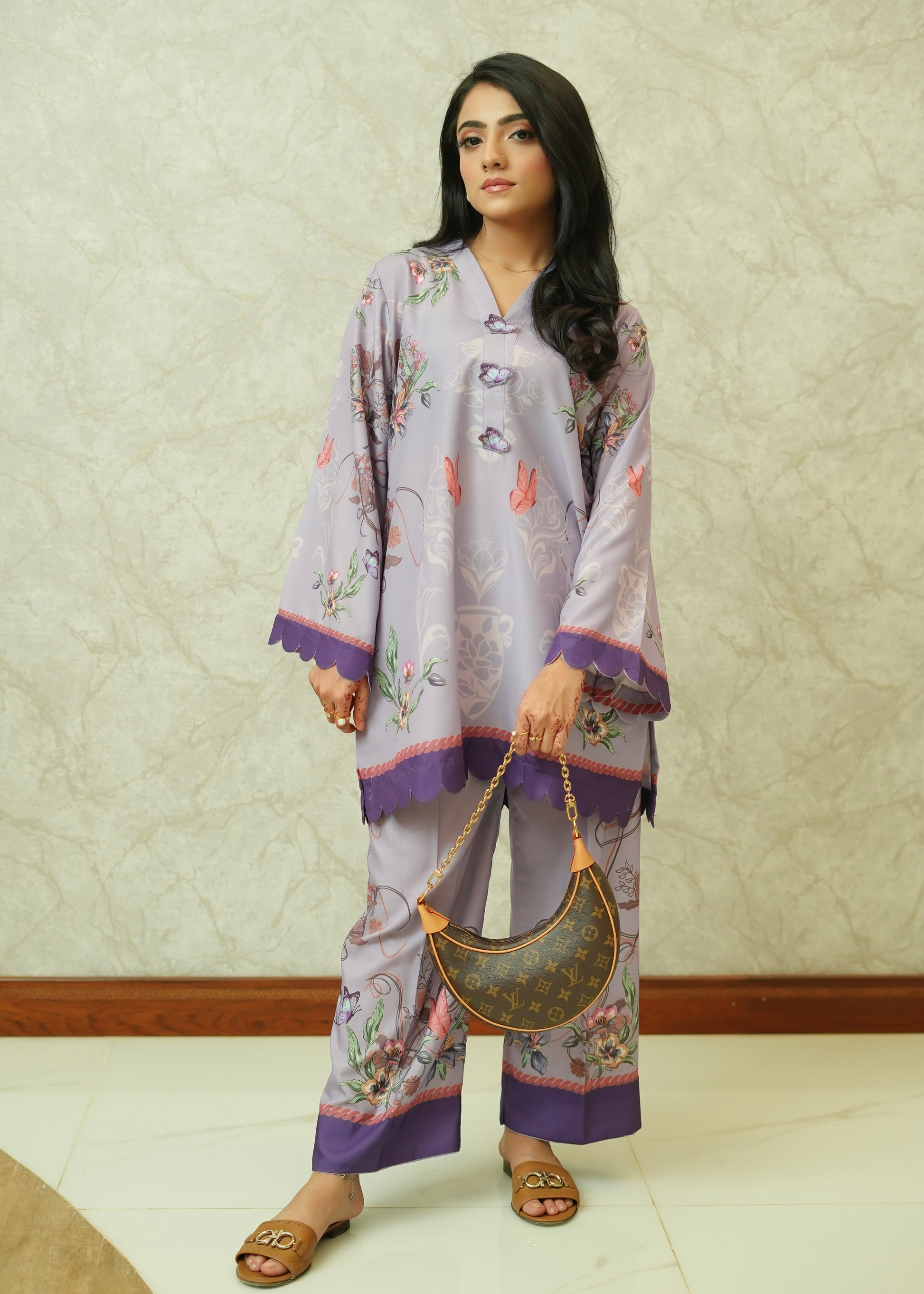 Embrace soft femininity with our Lilac Garden two-piece set. Made from our signature crease-resistant blended fabric, this outfit drapes beautifully while keeping you cool and polished throughout the day. The light purple base blooms with delicate floral illustrations inspired by spring gardens, adding a whimsical, romantic touch. Finished with graceful sleeves, ornamental borders, and a comfortable relaxed cut, Lilac Garden is perfect for those who love subtle charm with a modern twist.