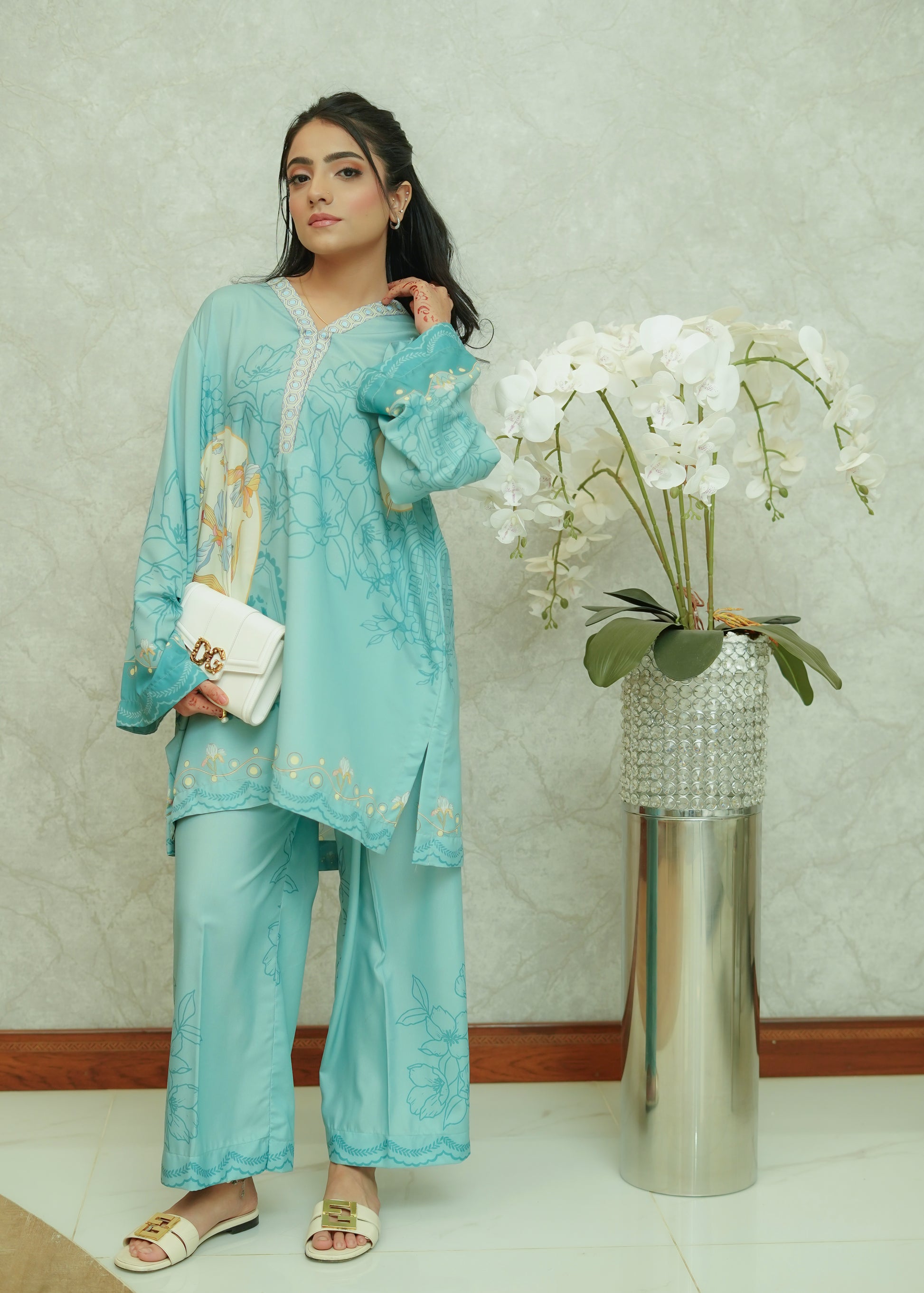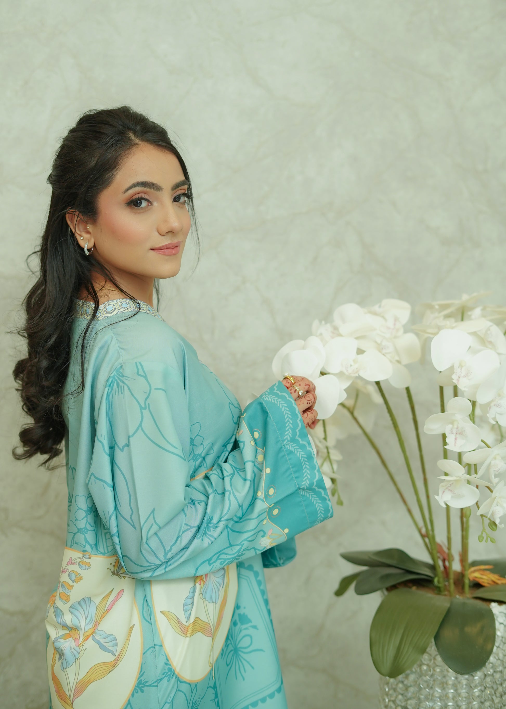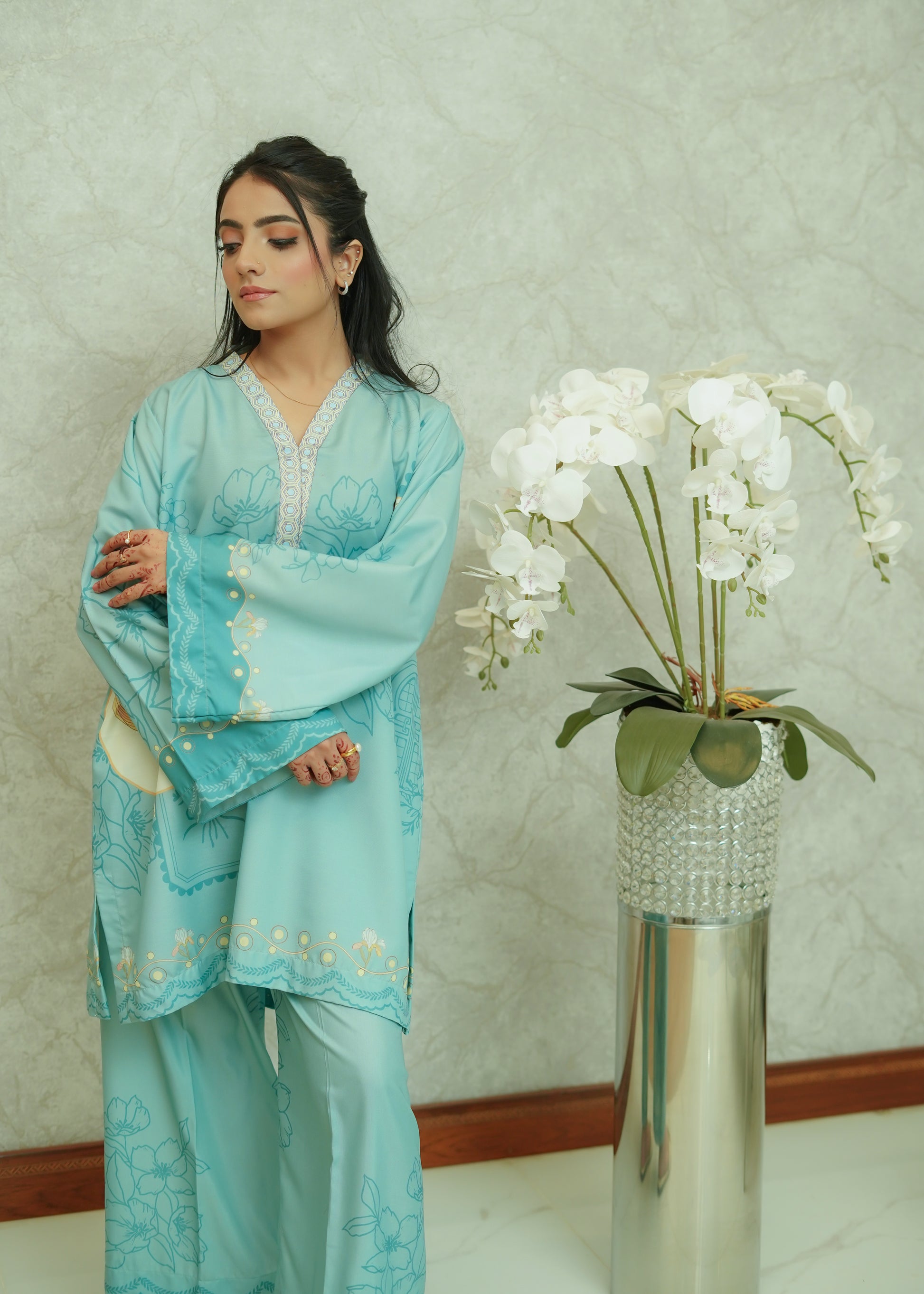 Refresh your wardrobe with the serene beauty of Mint Muse. Crafted from our premium in-house, crease-resistant fabric, this two-piece set offers the perfect blend of comfort and style. The soft mint green canvas is decorated with artistic botanical patterns and minimalistic motifs, giving it a calm, dreamy aura. With its airy sleeves, refined detailing, and relaxed silhouette, Mint Muse embodies effortless elegance for the summer season.