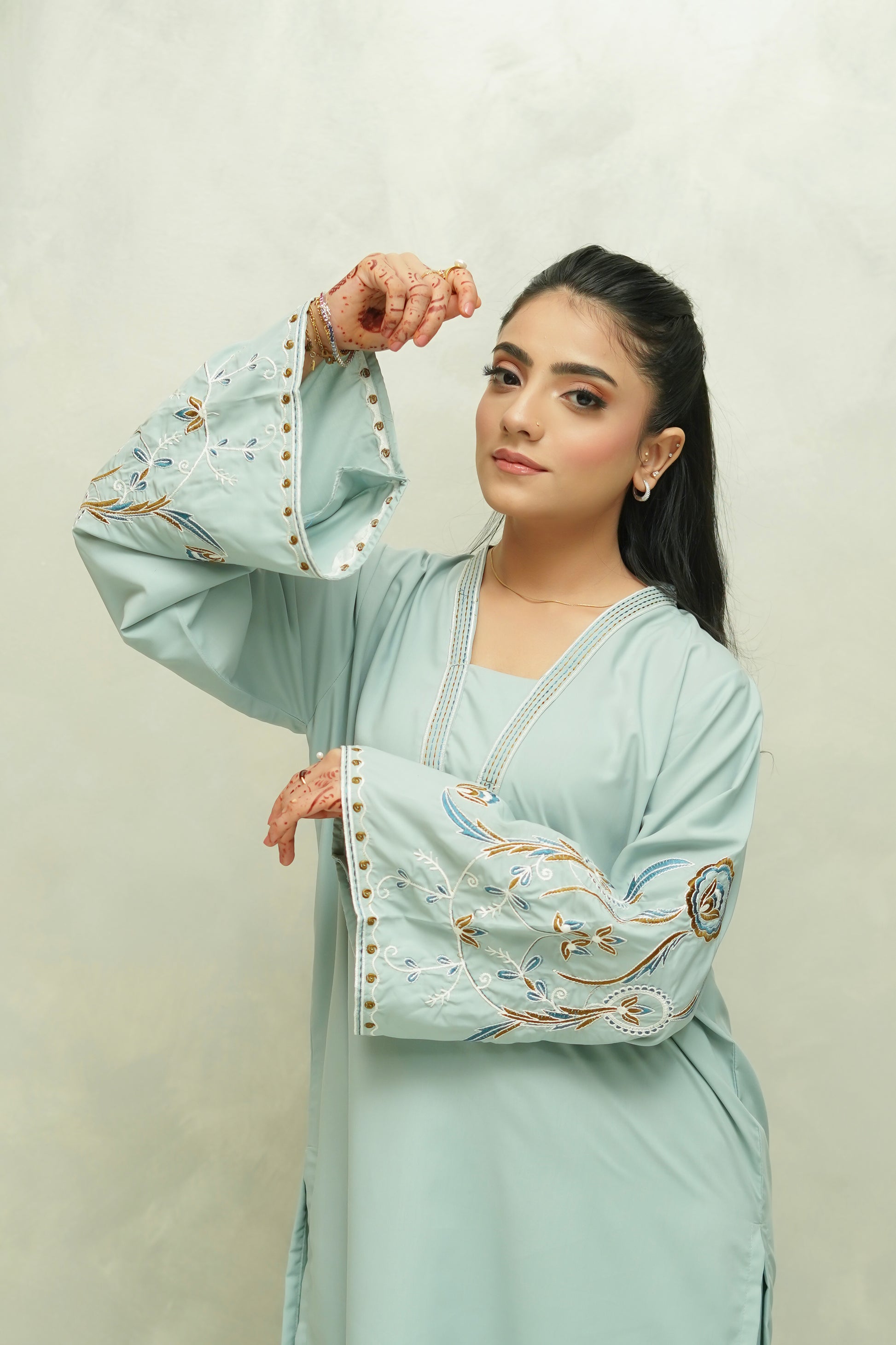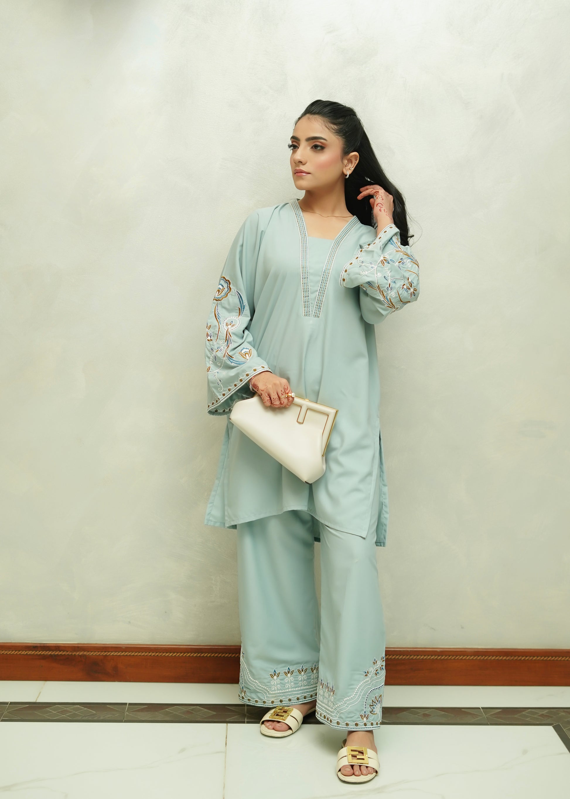 A refreshing winter essential, Ocean Mist blends softness and elegance in a serene light-blue hue. Crafted from premium blended viscose, this two-piece set features a delicately embroidered shirt paired with matching trousers, offering effortless comfort and style. Perfect for daytime outings, casual events, and breezy winter evenings.