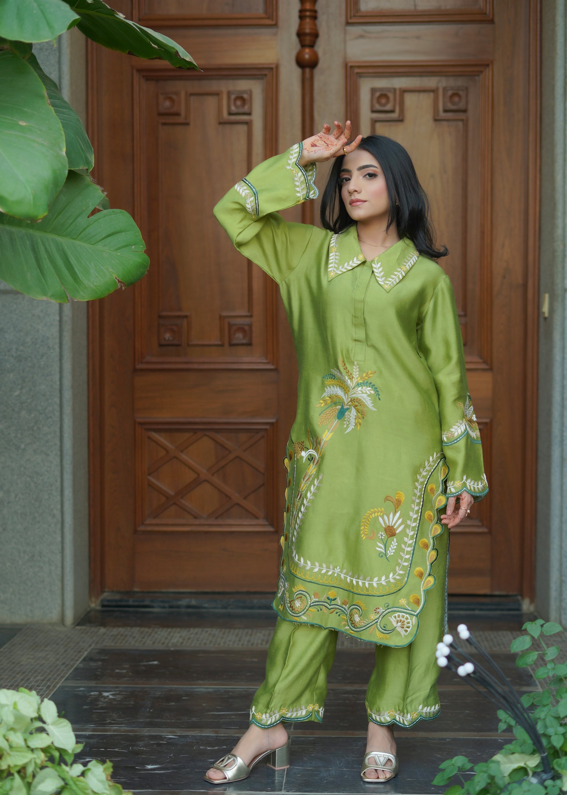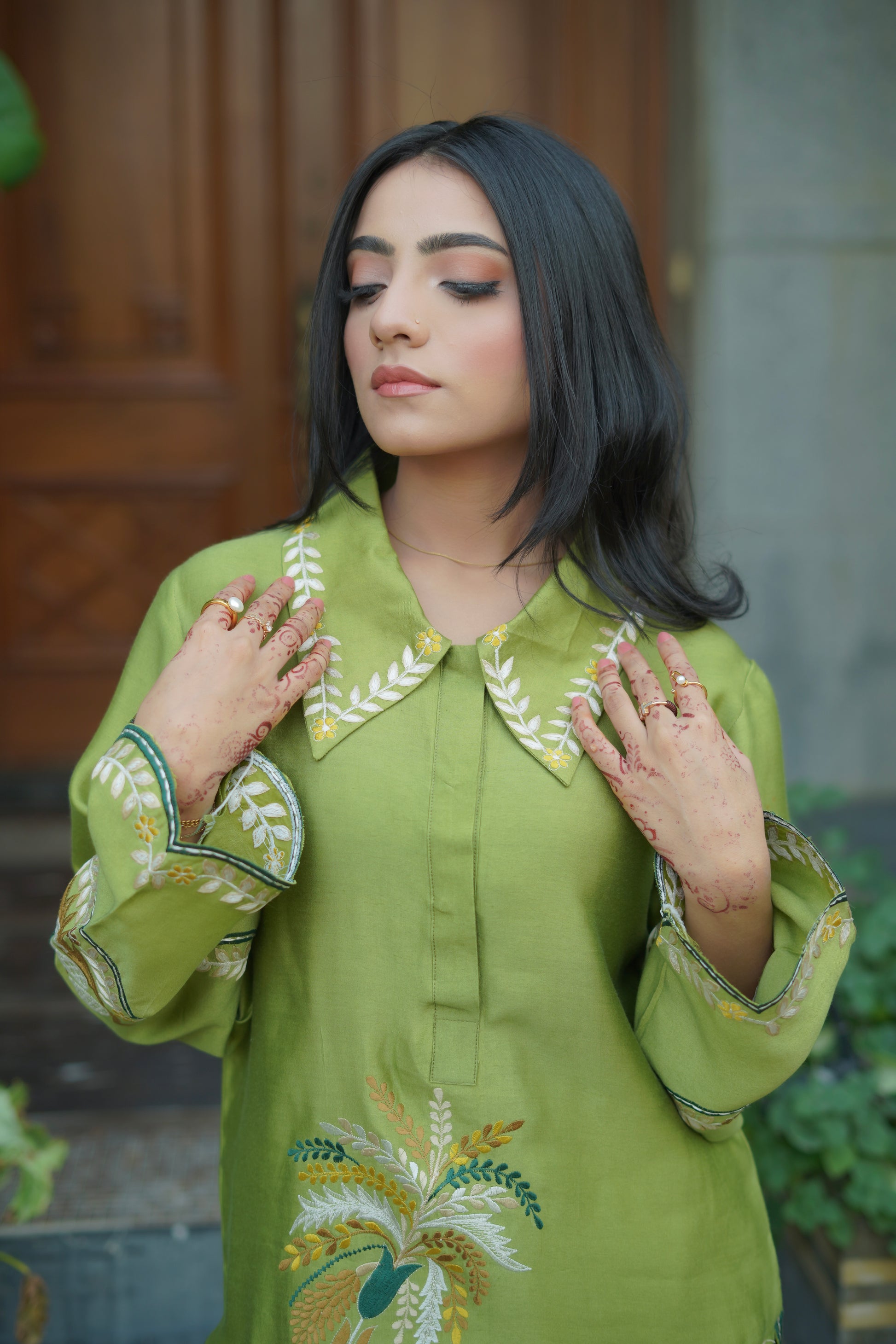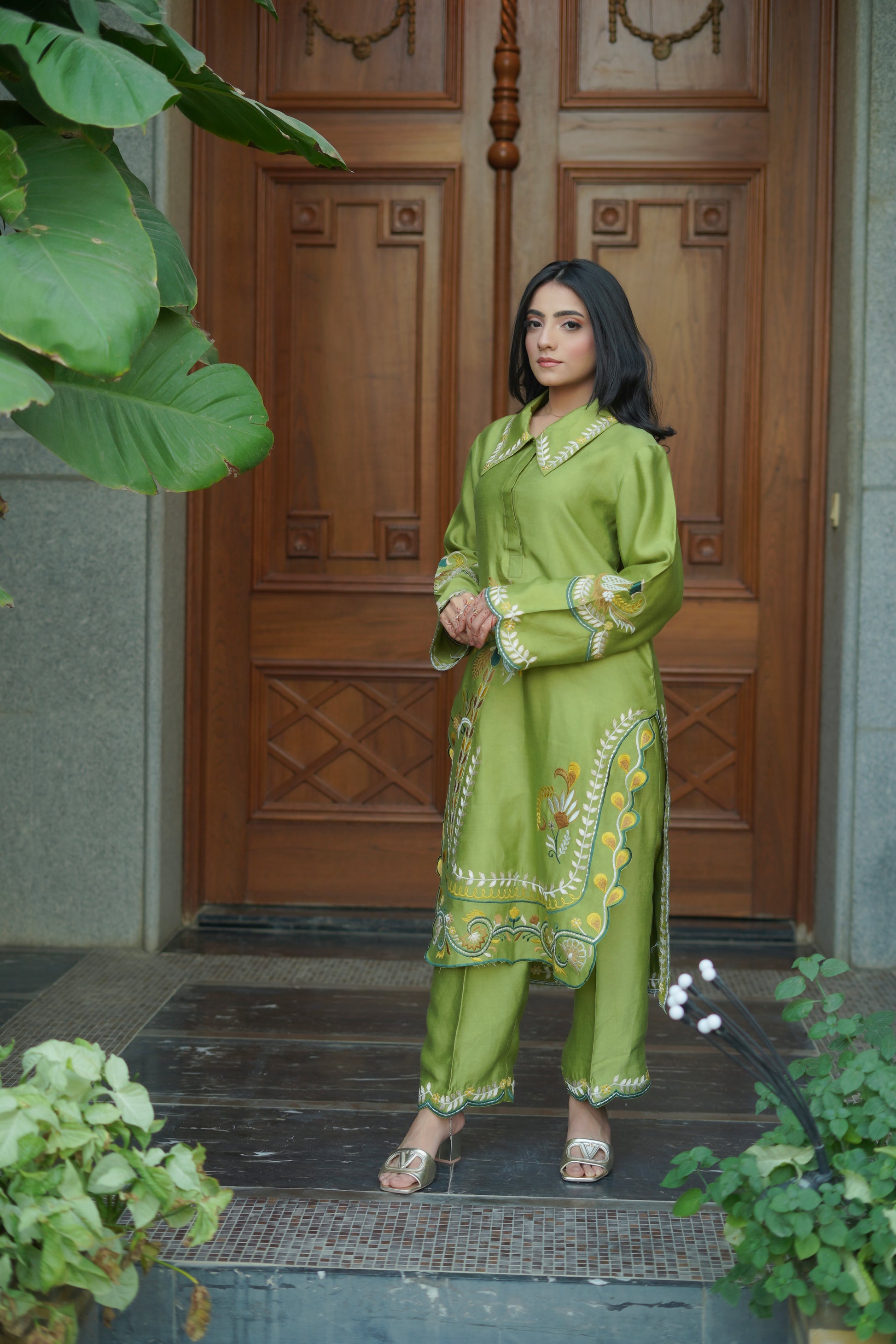 A refreshing pistachio-green canvas brought to life with intricate embroidery, paired with a warm mustard dupatta that adds the perfect pop of contrast. Crafted from premium Khaddi Silk, the outfit carries a gentle sheen, soft drape, and a naturally luxurious fall.